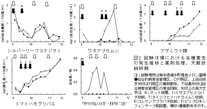 図2 試験ほ場における各種害虫の発生推移と薬剤処理,天敵放飼時期