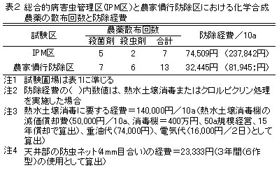 表2 総合的病害虫管理区(IPM区)と農家慣行防除区における化学合成農薬の散布回数と防除経費