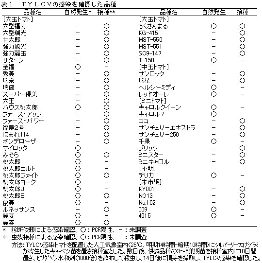2001〜2003年に熊本県内で栽培された23品種でTYLCVによる自然感染、発病が確認された(表1)。