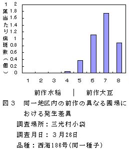 小麦-水稲-小麦の体系で作付けされた圃場では発生が少ない。しかし、小麦-ダイズー小麦で作付けされた圃場では初期の病斑数が多く、その後の発生も多くなり、枯れあがりも激しくなる(図3)。