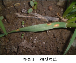 2月の茎立ち前の下葉に、周縁黄褐色の楕円形ないし不整形の褐色病斑を形成する(写真1)。3月に入ると下葉を中心に病斑数が増加する。