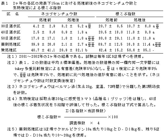 夏季にほ場を50日間湛水状態にすることで、地表下15cmのネコブセンチュウ密度は薬剤処理と同等に低下し,ネコブ指数を低く抑える。(表1)