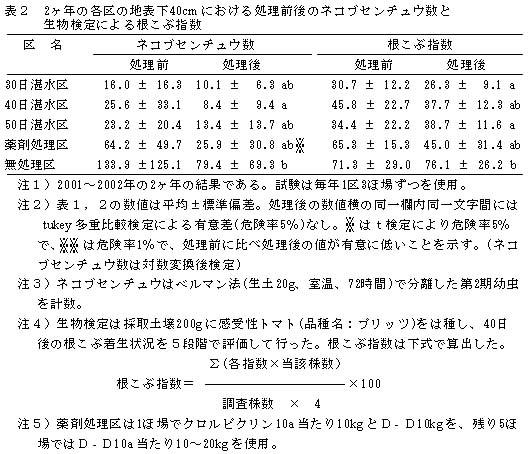 表2 2ヶ年の各区の地表下40cmにおける処理前後のネコブセンチュウ数と生物検定による根こぶ指数