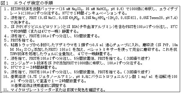 虫体からのウイルス抽出用に至適化されたエライザ法(図1)を用いることで、青色粘着トラップに付着したTSWV保毒アザミウマ1頭から前処理なしでTSWVを検出することができる。粘着物質による非特異反応は全く生じない。