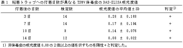 粘着トラップに付着したアザミウマはすぐに死ぬが、付着10日後でも実用レベルのELISA値を示し、TSWV保毒検定が可能である(表1)。