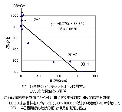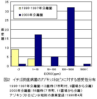 1996及び1997年に分離した13菌株のアゾキシストロビンに対するEC50は、0.03〜3.00ppmの範囲に分布したが、2003年に分離した56菌株のEC50は、0.52〜1822ppmの範囲に分布し、1〜10ppm及び100〜1000ppmを頂点とする二峰性を示す(図2)。
