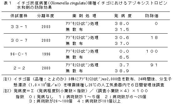 - イチゴ苗を用いた防除試験において、2003年に県内から分離したイチゴ炭疽病菌(Glomerella cingulata)の中に、アゾキシストロビン水和剤の防除効果が低い耐性菌が認められる(表1)。