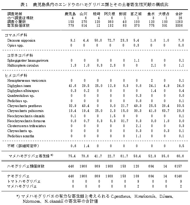 - 鹿児島県内8地域における,3,4月の露地栽培エンドウのナモグリバエに寄生する土着寄生性天敵のうち、種名が確認できたものは3科12種である。このうち、マメハモグリバエに対して有力な寄生蜂の比率は22.7〜75.4%である。