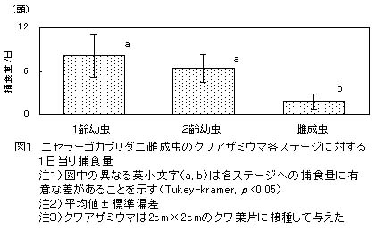 摂氏25度条件下でニセラーゴカブリダニ雌成虫にクワアザミウマ1齢および2齢幼虫、雌成虫をそれぞれ20頭与えた場合の1日当たり捕食量は、それぞれ8.1頭、6.4頭、1.8頭である(図1)。