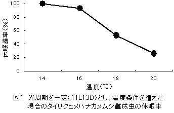 短日条件(11L13D)におけるタイリクヒメハナカメムシの休眠率は飼育温度が高くなるにつれて低下し,休眠誘起の臨界温度は摂氏18度付近である(図1)。