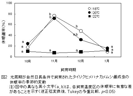 11月上旬〜12月上旬に摂氏20度以下で,12月上旬〜1月上旬に摂氏18度で飼育されると休眠率が高く,冬季で最も休眠率が高くなるのは11上旬〜12月上旬に育った個体群である(図2)。