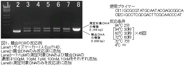 測定対象の遺伝子領域と同じプライマーで増殖するが少し短い競合DNAを作成し、このDNAを規定濃度でPCR反応液に添加することで、互いのDNA増幅に競合反応が生じる(図1)。