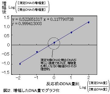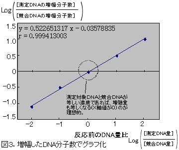 競合DNAの分子数と、増幅したそれぞれのDNA分子数の比率は、対数軸のグラフ上で定数項が0の一次相関になる。この回帰式から測定対象のDNA濃度を推定できる(図2、図3)。