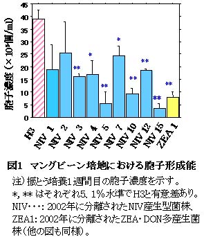 マングビーン培地におけるNIV産生型菌株の胞子形成能は、いずれもH3菌株より劣り、H3菌株の1/10〜2/3程度である(図1)。