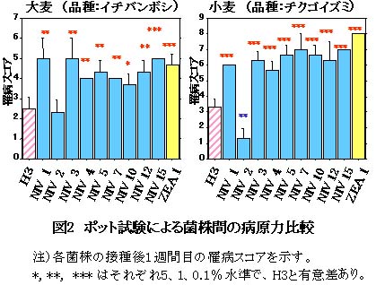 オオムギ・コムギにおけるNIV産生型菌株の病原力は、H3菌株の1/2〜同程度である1菌株(NIV2)を除き、いずれもH3菌株より高い(図2)。