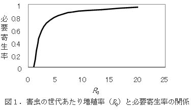 - 寄主である害虫の世代あたり増殖率(R0)と必要寄生率の関係は、図1のようになる。