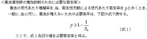 - 式1 害虫個体群の増加抑制のために必要な寄生率