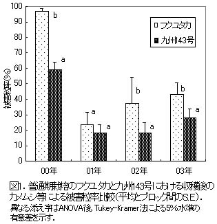 図1 普通期栽培のフクユタカと九州143号における収穫後のカメムシ等による被害粒率比較(平均とブロック間のS.E.)
