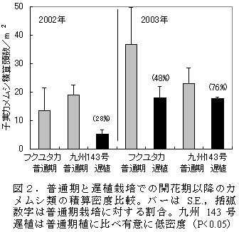 図2 普通期と遅植栽培での開花期以降のカメムシ類の積算密度比較