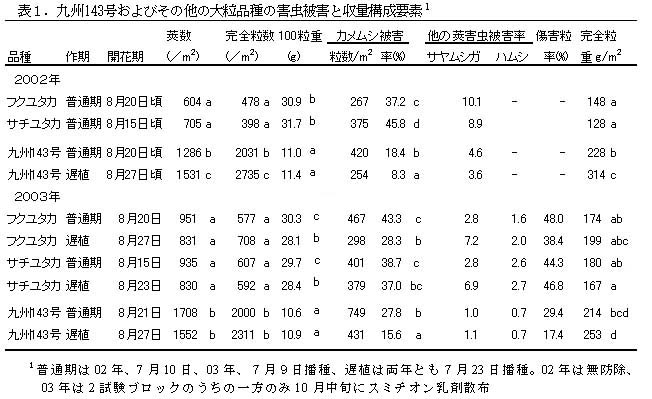 小粒多莢の九州143号を遅植すると、カメムシ類の被害を大幅に軽減することが可能で、カメムシ被害が激しい年でもほぼ無農薬で安定的な収量を確保できる(表1)。なお、この方法はサヤムシガ等の他の莢害虫に対しても効果がある。