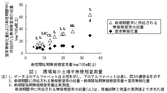 土壌から栽培期間中に供給される無機態窒素の総量は、圃場により異なる。栽培期間中の窒素無機化量は多くの圃場で10mg/100g乾土程度であるため、栽培開始期の無機態窒素量+10(mg/100g乾土)により、栽培期間中に供給される無機態窒素の総量を推定できる(図1)。