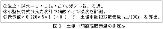 土壌中無機態窒素のうち大部分が硝酸態窒素であるため(データ略)、無機態窒素量は硝酸態窒素量に置き換えることができ、小型反射式分光光度計での簡易診断が可能である。壌土、埴壌土、軽埴土では、生土:純水=1:5で浸出、ろ過した液中の硝酸イオン量をaとすると、