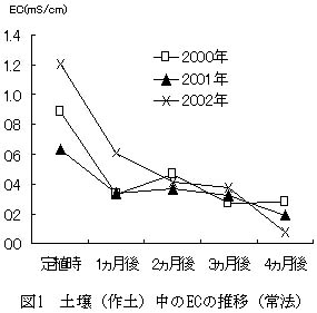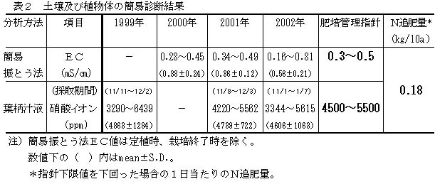- 標肥区の栽培中の株間土壌(深さ0〜15cm)のECは、約0.2〜0.5mS/cmで推移する(図1)。簡易振とう法によるECについても常法とほぼ同様の値で推移するが、好適な生育を維持するためには簡易振とう法ECで0.3〜0.5mS/cmで管理する(表2)。