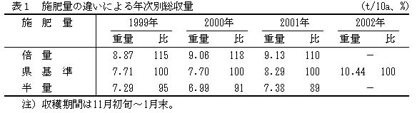 表1 施肥量の違いによる年次別総収量(t/10a、%)