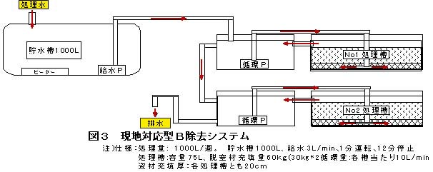 養液循環式のイチゴ高設栽培からの廃液に対しては、現地対応型B除去システム(高濃度少量廃液処理タイプ、図3)が有効であり、1週間当たり1,000Lの廃液(含有硝酸性窒素濃度:約100ppm)を3日で数ppm以下に処理することが可能である(データ略)。