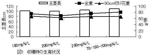 収穫時の主茎長は生育ステージ毎に窒素量、かん水量を変化させた70-150-100mgN/L区が他の区を上回るが、90cm切花重、切り花品質については施肥窒素量の違いによる差は見られない(図1)。