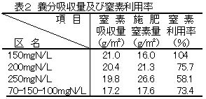 - 収穫時の総窒素吸収量は各区とも約20g/m2で変わらないが、施肥窒素量が26.6g/m2では窒素利用率が約60%に低下していることから、本試験の培養土では17g/m2が適正窒素施用量と考えられる(表2)。