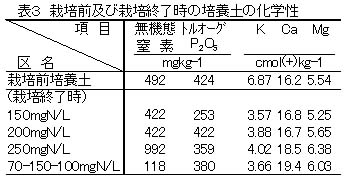 培養土に牛ふん堆肥を混合することによって、培養土中のリン酸、カリ等の成分は不足しないことから,窒素だけの施用(液肥)で輪ギク生産が可能である(表3)。