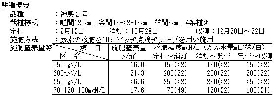 - 以上のことから、隔離ベッドを利用したかん水施肥栽培では、培養土に牛ふん堆肥を混合することで窒素のみの施肥でキク栽培が可能である。この時の施肥窒素量は17g/m2、液肥濃度は200mgN/L程度が適当である。
