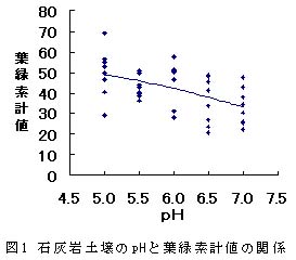 図1 石灰岩土壌のpHと葉緑素計値の関係