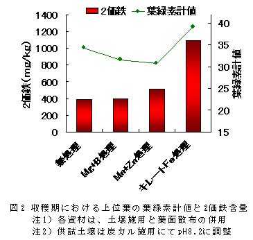 キレート鉄の施用によって、上位葉の2価鉄含有率が高まり,黄化症状は軽減される(図2)。