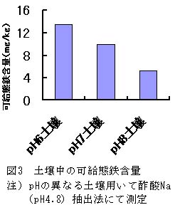 土壌中の可給態鉄含量は、土壌のpHの上昇に伴って低くなる(図3)。
