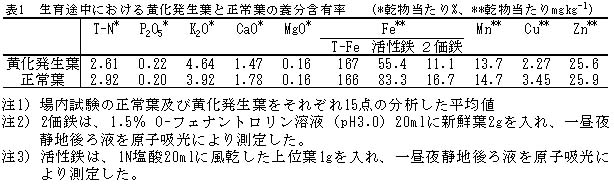 表1 生育途中における黄化発生葉と正常葉の養分含有率