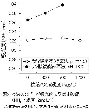 インドフェノール色素の呈色は、pHの影響を受けやすいため緩衝液中で行うことが多い。しかし原法(リン酸緩衝液)では検液のカルシウムイオン濃度が高いとリン酸イオンと反応して懸濁物が生成し吸光度に正の誤差を生じる。緩衝液に炭酸緩衝液を用いることでこの干渉が抑えられる(図2)。