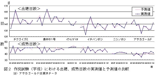 図2 作況試験(宇佐)における出穂、成熟日数の実測値と予測値の比較