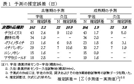 宇佐において播種期から出穂期を予測したときの推定誤差は麦類計で2.2日、品種間では1.6〜2.7日であった。出穂期から成熟期を予測したときの推定誤差は麦類計で1.9日、品種間では0.9〜2.7日であった(表1)。