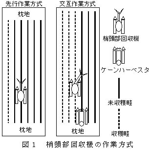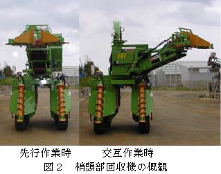 開発機は機体中央に幅510mm、地上高1,400mmの空間がある門型である。作業方法は、サトウキビ収穫に先がけほ場全面のサトウキビ梢頭部を回収する先行作業方式、サトウキビ収穫時にケーンハーベスタと交互に作業し梢頭部を回収する交互作業方式が可能である。(図1、図2)