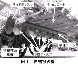 開発機は生草マルチ切断および作溝用の3枚ディスク、マルチ鎮圧用の鎮圧ローラおよび全面フロートに改良した、生草マルチ栽培用の6条型不耕起田植機である(表1、図1、図2)。