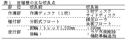 移植方法は、3枚ディスクで、生草マルチの切断と植付用の作溝を行い、鎮圧ローラでマルチを均平化する。さらに全面フロートでマルチを押さえた後、植付爪で移植する(表1、図1、図2)。