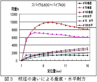 パイプ付きスパイラル杭(パイプ埋没長400mm、スパイラル長600mm)について、スパイラル及びパイプの径をφ50、75、100と大きくすると、垂直及び水平耐力1.5〜9.9kN及び1.9〜3.2kNに増加する(図3)。