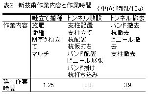 新被覆栽培技術の資材費は、M字うね成型機年償却費9,000円、トンネル資材費は10aあたり約31,000円である(表1)。10aあたり作業時間は播種同時M字うね立て同時施肥同時マルチ作業1.25時間、トンネル敷設作業延べ8.8時間、トンネル撤去作業延べ3.9時間である(表2)。