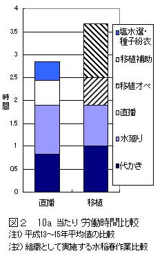 組織的に実施する水稲の春作業(直播は塩水選・種子粉衣・水廻り・代かき・播種、移植は水廻り・代かき・移植)について、直播と移植の10a当たり労働時間を比較すると、移植に比べ直播では約23%減少する(図2)。