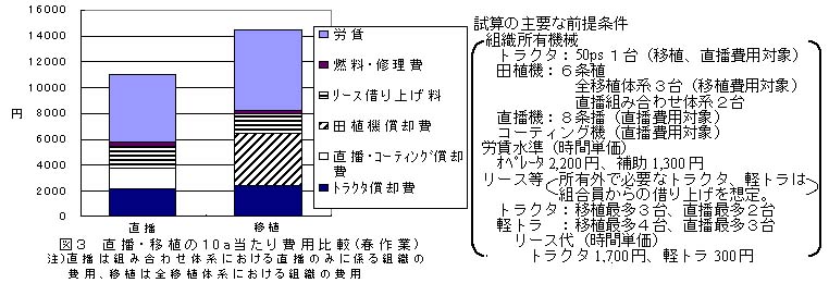 また、想定規模(直播は直播10ha+移植20haの組み合わせ、移植は移植30ha)において、直播のみに係る組織としての費用と、移植のみに係る組織としての費用を比較すると、10a当たりの春作業費用は、直播では機械償却費の削減と人件費の削減により、移植の約24%の低減が見込まれる(図3)。