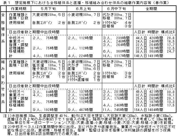 水田50ha規模、生産調整率40%で、水稲は全て移植とする体系(全移植体系)と直播を10ha導入する体系(直播・移植組み合わせ体系、直播機1台導入)を比較すると、全移植体系は移植時期に集中して多くの出役者や機械装備が必要であるのに対し、直播・移植組み合わせ体系では移植時期の出役者数、補助労働時間、機械台数が削減できるが、麦類収穫作業と水稲直播作業の同時期化により5月下旬や6月上旬にもオペレータの確保が必要になり、兼業等農繁期の一部に出役するオペレータの役割が高まる(表1)。