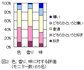 試飲アンケートの結果、色および香りについて評価が高く、「好き」あるいは「どちらかというと好き」という回答が全体の40%以上を占める(図2)。