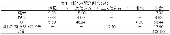 従来の清酒製造原料のうち、蒸米の50%(重量比)を蒸した有色ジャガイモに置換することによりアルコール度11.3%の醸造酒を製造できる(表1)。